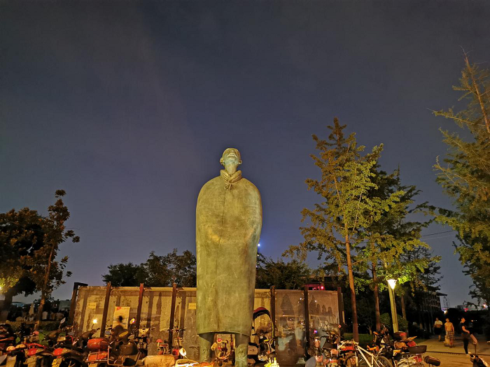 《高山流水》青銅雕塑,參考秦兵馬俑的照明手法,以白色燈光重點(diǎn)照亮雕塑頭部,仿佛在迎著陽光沉思。