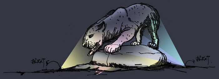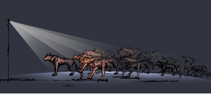 《狼來了》百匹狼群,以重點(diǎn)照明的方式著重刻畫頭狼及狼群的氣勢(shì)。狼群的后部,在狼眼處涂抹熒光粉,配合黑光燈,使狼眼在黑暗處散發(fā)出寒光。從整體上感覺狼群漸漸從黑暗中走出,給人一種狼來了的動(dòng)態(tài)氣勢(shì)。