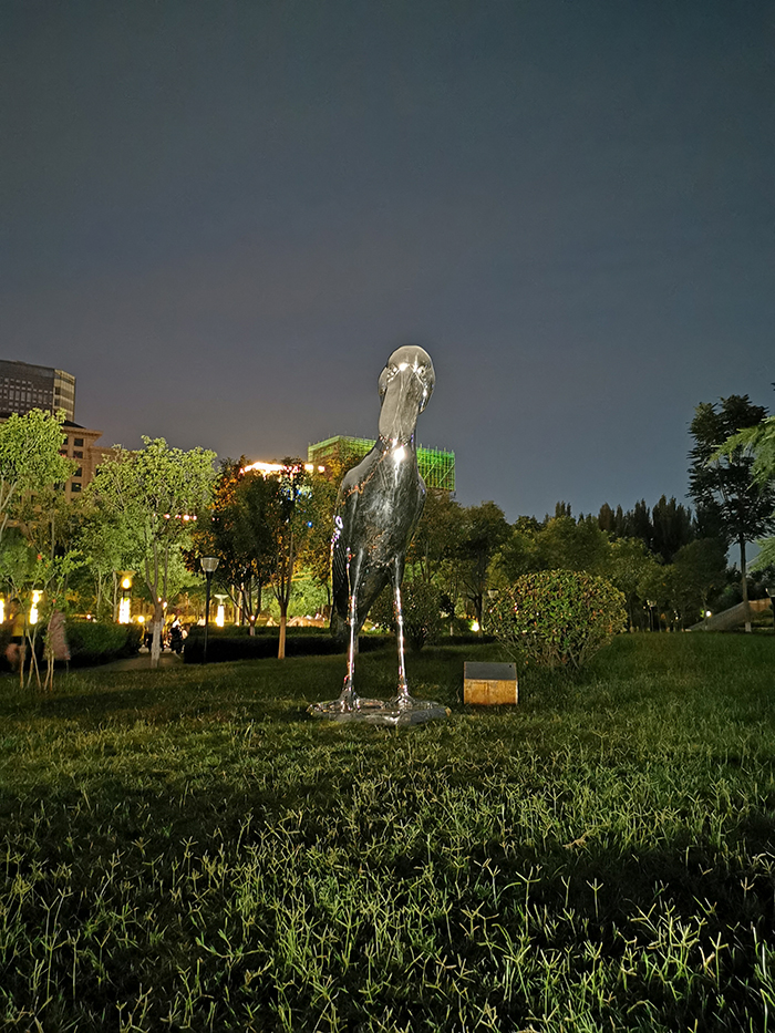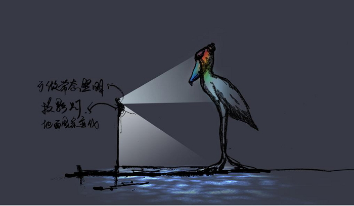 《鯨頭鸛》用水紋燈映亮雕塑周圍環(huán)境,以彩色小型投光燈對(duì)雕塑局部染色,一副艷麗的鯨頭鸛在河邊休憩的場(chǎng)景便映入眼簾。