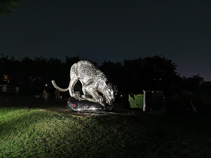 《金錢豹》以彩色小型投光燈照亮,通過鏡面不銹鋼的折射,雕塑變得色彩斑斕。
