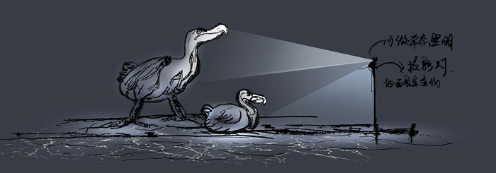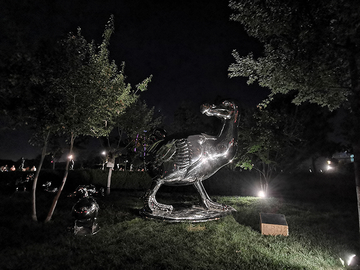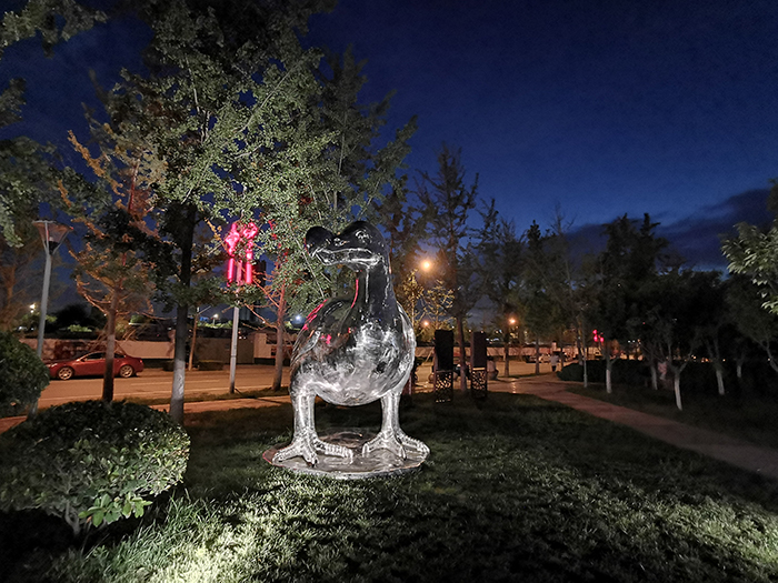 《渡渡鳥》用樹影燈映亮雕塑周圍環(huán)境,以小型投光燈重點(diǎn)強(qiáng)調(diào)雕塑局部,仿佛渡渡鳥又回到了這個(gè)世界。