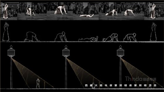 3)重大節日模式下所有照明燈具全開,重要節點投影經文開啟,使大昭寺成為一個巨大的轉經筒與朝拜的人一起緩緩轉動。