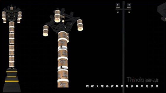 大昭寺是四層樓的碉堡式建筑結構,各殿宇樓頂形狀高低不一,為全面營造金頂的夜間氛圍,信達科技采用投光燈投射金頂的設計方案。投光燈分布在圍繞大昭寺的十個點位上,根據被照物高度、角度設置燈具數量、高度、角度、方向,以實現金頂的整體亮度統一。