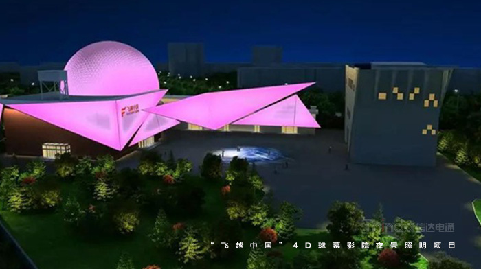 在光色的設(shè)計中,信達(dá)電通采用皓白、暖黃、科技藍(lán)等多種顏色漸變切換的設(shè)計手法。燈光重點勾繪外圍建筑輪廓,突出建筑的獨特結(jié)構(gòu),與球幕影院和廣場地面的投影形成互補(bǔ)和諧的夜景畫面。