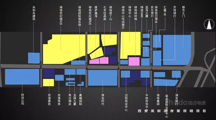 1991年3月西安高新區被國務院首批批準為國家級高新區,如今,西安高新區已成為一個代表西安與西部高新科技產業前沿的領地。2016年,西安高新區整體提升夜景照明,信達電通對高新區灃惠南路、唐延路和錦業路三條主干道及輻射的周邊建筑進行亮化升級改造,區域全長6.4KM。