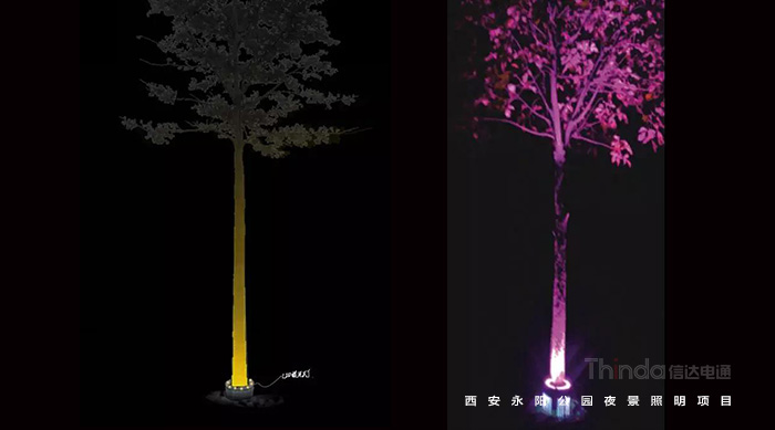 樹池內(nèi)比較筆直的樹木,采用抱箍投光燈,整潔美觀,不破壞白天景觀效果;